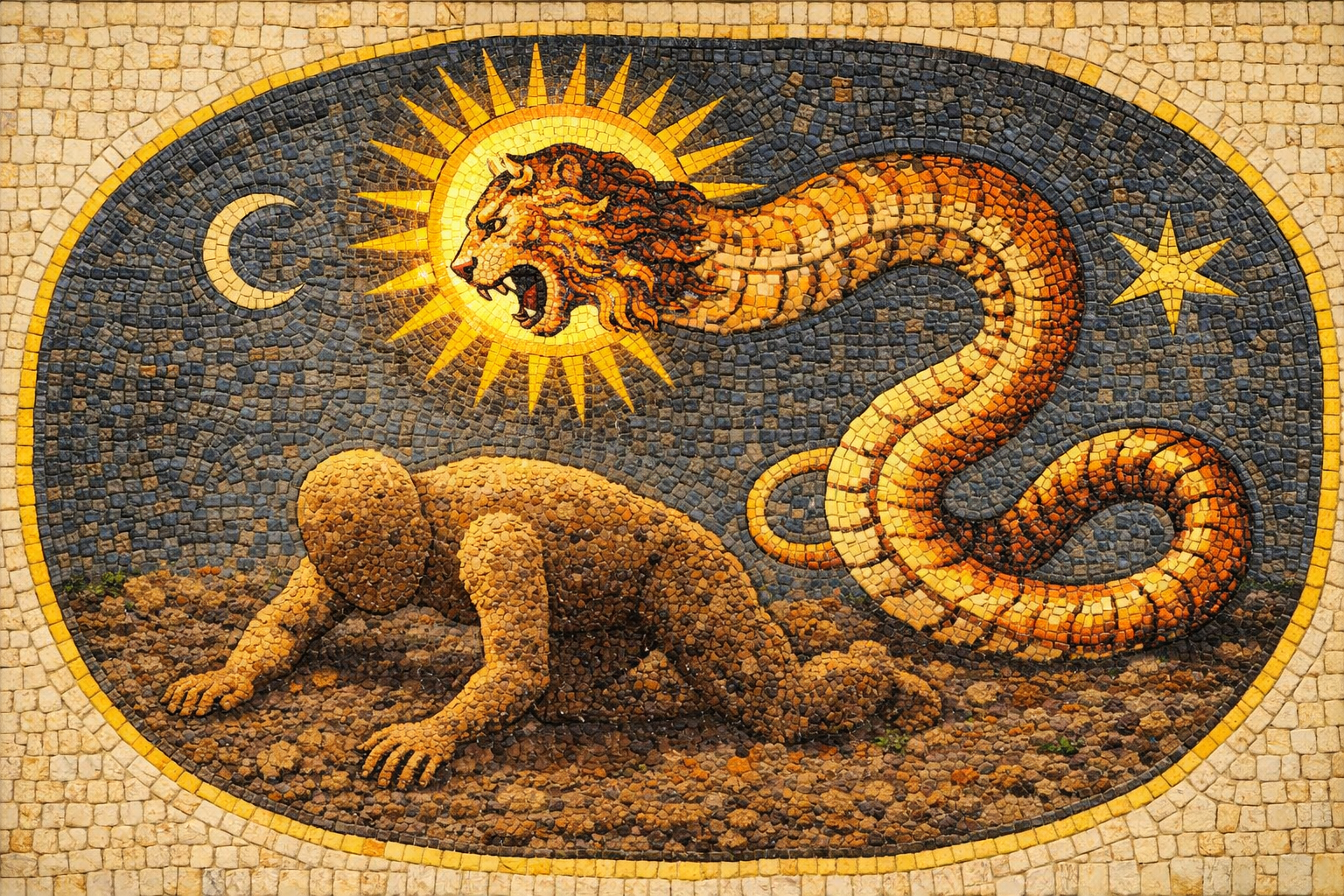 Eliénzys, l'Esprit Voyageur, la vit dans sa chair. Apollonios vient de le quitter. Il erre seul dans le désert, portant au cou l'anneau mystérieux — un ouroboros, serpent qui dévore ou engendre sa propre sphère — héritage énigmatique d'une lignée de fils de la Lumière. Dans cette solitude, une douleur surgit qu'il ne sait pas nommer : de quel mal peut donc souffrir un Esprit Voyageur ? Ce mal est précisément celui que l'épisode cherche à comprendre : la douleur d'un être qui aspire à l'absolu et éprouve le monde comme inadéquat à cette aspiration. Eliénzys n'est pas un personnage au sens ordinaire : il est la figure imaginale dans laquelle se concentre toute la tension spirituelle d'une époque — l'époque charnière où le monde antique bascule vers le christianisme et où l'âme se voit pour la première fois condamnée à se haïr elle-même.